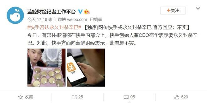 12月22日消息 今日,有媒体报道称在快手内部会上,快手创始人兼CEO宿华表示要永久封杀辛巴(原名辛有志)。现据蓝鲸财经报道,对此,快手方面表示,此消息不实。