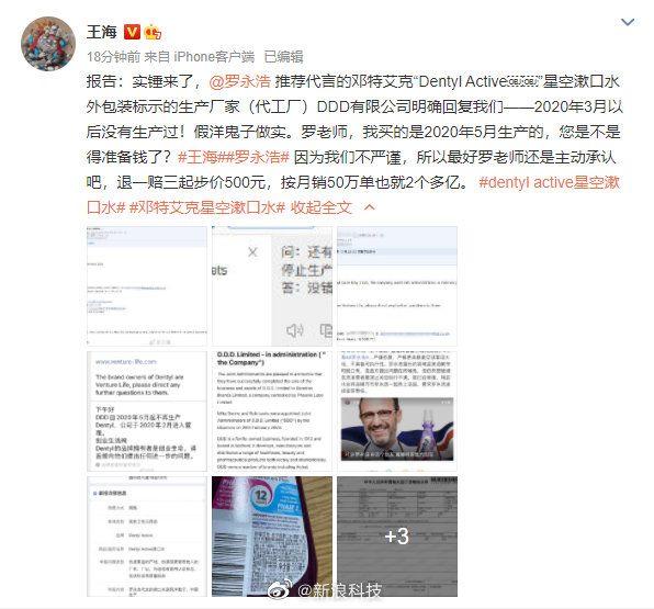 12月22日晚间消息,针对“罗永浩带货漱口水涉嫌虚假宣传”一事,职业打假人王海在微博上再度回应表示,罗永浩推荐代言的邓特艾克“Dentyl Active”星空漱口水外包装标示的生产厂家(代工厂)DDD有限公司明确回复称——2020年3月以后没有生产过!假洋鬼子坐实。