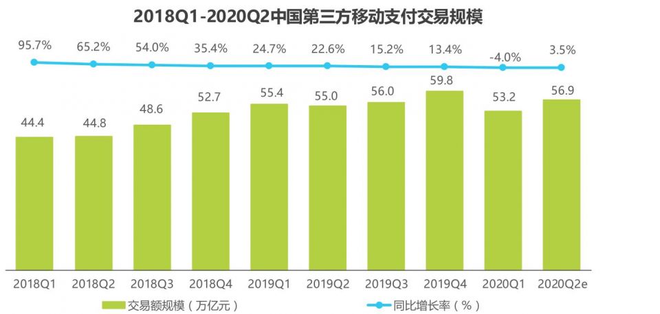 根据艾瑞咨询研究报告显示,中国第三方移动支付从2018年第4季度至2020年第2季度,平均每个季度移动交易额为50多万亿,也就是说,中国移动支付一年的交易规模高达200多万亿。