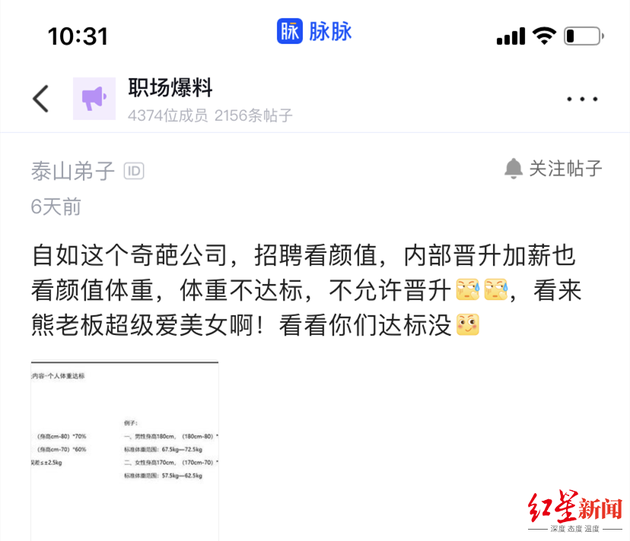 12月23日,红星新闻记者通过脉脉App看到该帖。ID名为“泰山弟子”的网友疑似自如员工爆料,“自如这个奇葩公司,招聘看颜值,内部晋升加薪也看颜值体重,体重不达标,不允许晋升,看来熊老板超级爱美女啊!”