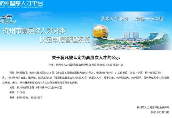 蒋凡(所属部门:未来科技城国际人才园(余杭区五常街道荆长大道601号2F,电话88675879);工作单位:淘宝(中国)软件有限公司),男,1985年08月出生,经审核,拟认定为C类(经授权企业自主认定C类人才)高层次人才,现予公示,公示期三天。公示期间,任何单位和个人均可通过来信、来电、来访等多种形式向市人力社保局反映对象存在的问题。