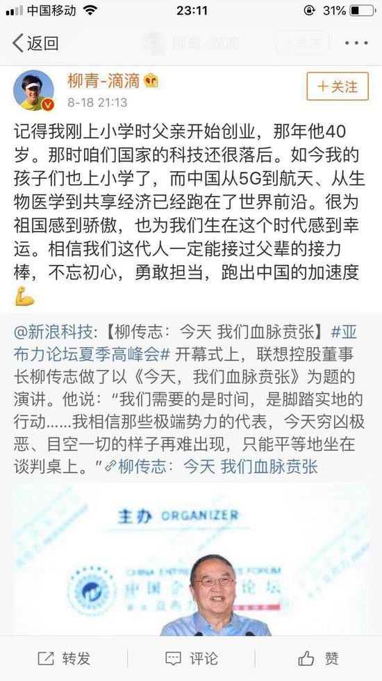 滴滴出行总裁柳青晚间转发父亲联想控股董事长柳传志的演讲视频,并发微博称,为祖国感到骄傲,也为生在这个时代感到幸运,相信自己这一代人定能接棒父辈,不忘初心,勇敢担当,跑出中国的加速度。