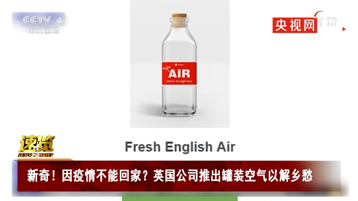 商业 因疫情不能回家?英国推出罐装空气解乡愁,每瓶219元 2020-12-25 10:01:16 分享 来源:央视新闻【#英国公司推出罐装空气#助游子解乡愁 每瓶219元人民币】因疫情肆虐,许多背井离乡的英国人无法回家过节。英国一家公司趁机推出了来自家乡的罐装空气,供海外游子一解思乡之苦。目前该公司出售的瓶装空气主要有四款,分别为英格兰、苏格兰、威尔士和北爱尔兰“口味”,每瓶售价25英镑(约合219元人民币)。