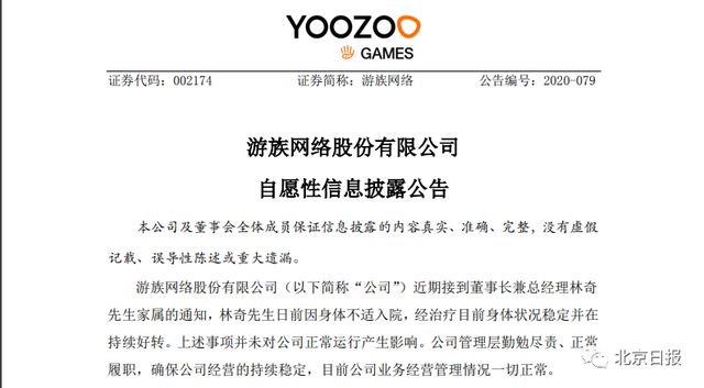 其一,游族网络董事长林奇先生于12月16日晚返家途中出现急性不适症状,随即自行赶赴医院,院方在治疗过程中第一时间与警方取得联系,目前治疗方案和原因调查双线都有明确进展,林总目前正在住院恢复治疗,各项体征稳定——请关心林总健康的朋友们放心。