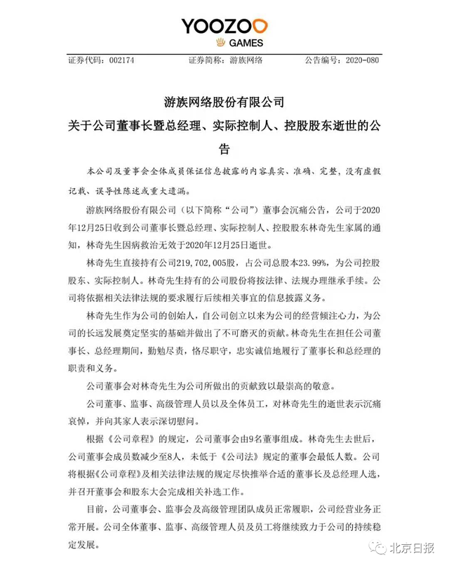 12月25日晚间,游族网络公告表示,公司董事长暨总经理、实际控制人、控股股东林奇因病救治无效于2020年12月25日逝世。