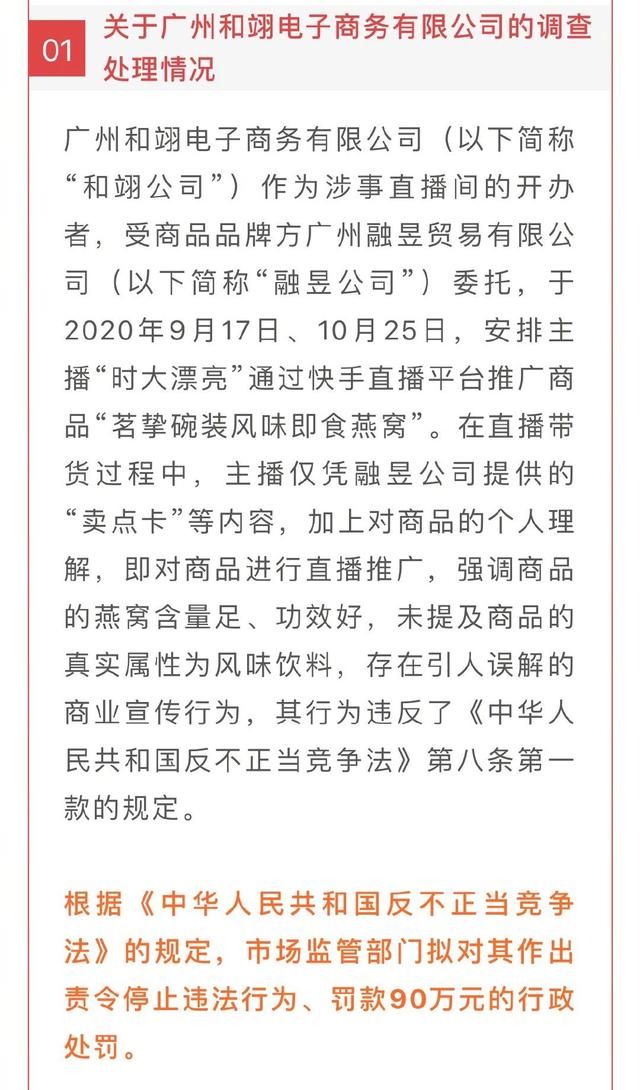 据公告,广州和翊电子商务有限公司(以下简称“和翊公司”)作为涉事直播间的开办者,受商品品牌方广州融昱贸易有限公司(以下简称“融昱公司”)委托,于2020年9月17日、10月25日,安排主播“时大漂亮”通过快手直播平台推广商品“茗挚碗装风味即食燕窝”,在直播带货过程中,主播仅凭融昱公司提供的“卖点卡”等内容,加上对商品的个人理解,即对商品进行直播推广,强调商品的燕窝含量足、功效好,未提及商品的真实属性为风味饮料,存在引人误解的商业宣传行为,其行为违反了《中华人民共和国反不正当竞争法》第八条第一款的规定。根据《中华人民共和国反不正当竞争法》的规定,市场监管部门拟对其作出责令停止违法行为、罚款90万元的行政处罚。