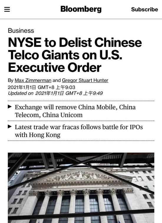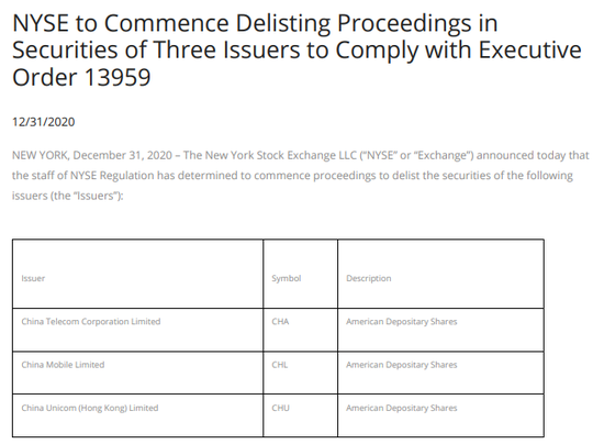就在行政命令生效前夕,当地时间2020年12月31日,纽交所宣布,将对中国移动有限公司、中国电信股份有限公司、中国联通(香港)有限公司进行退市处理。根据交易所的声明,三家公司将在1月7日至1月11日期间退市。