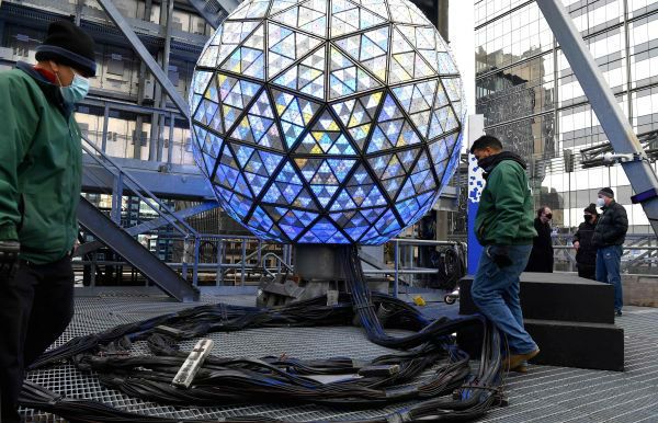2020年12月30日,工作人员正在对纽约时报广场的水晶球进行最终调试