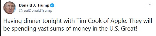 不过,特朗普更希望的是让苹果在美国生产。16日,特朗普在和库克谈话前,曾发布推特称,苹果“将在美国砸大钱投资”。