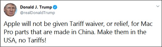 7月26日,特朗普发表推特,拒绝苹果要求旗下产品豁免关税的呼声:“让他们在美国制造,就没有关税!”