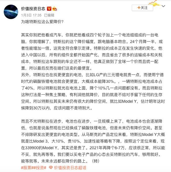 1月3日,微博博主@价值投资日志在发布的帖文中表示,如果把特斯拉看成是四个轮子加上一个电池组组成的一台电脑,特斯拉的这个降价幅度,跟电脑基本吻合。24个月降一半,或者性能增加一倍,这完全符合摩尔定律。