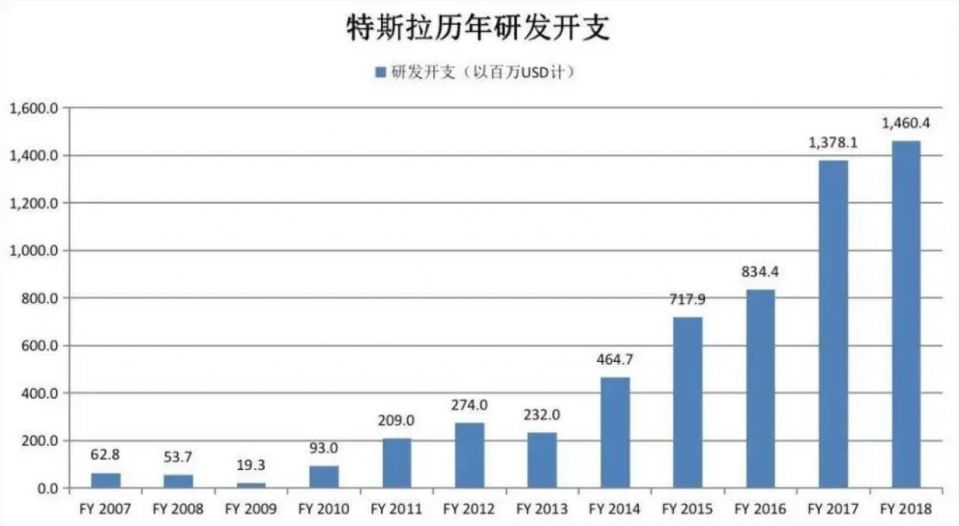 特斯拉从2011年起,每年支出2亿美元以上的研发费用;到了2014年Model S上市之后,这笔费用飙升到了4.6亿美元,2015年升至7亿美元。