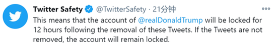 推特安全账号刚刚发声明称:“特朗普的账号将被冻结12小时。”他们声称,如果未来有进一步违反平台规则的情况发生,包括暴力威胁政策等,将会导致账号被永久移除。