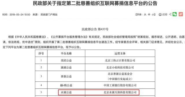 依靠“大病筹款”模式发展壮大的水滴筹,究竟是“公益”还是“生意”引发媒体质疑。据猛犸新闻在6日的的报道中指出,早在2018年5月,民政部发布的《关于指定第二批慈善组织互联网募捐信息平台的公告》中,北京水滴互保科技有限公司的“水滴公益”就位列其中。