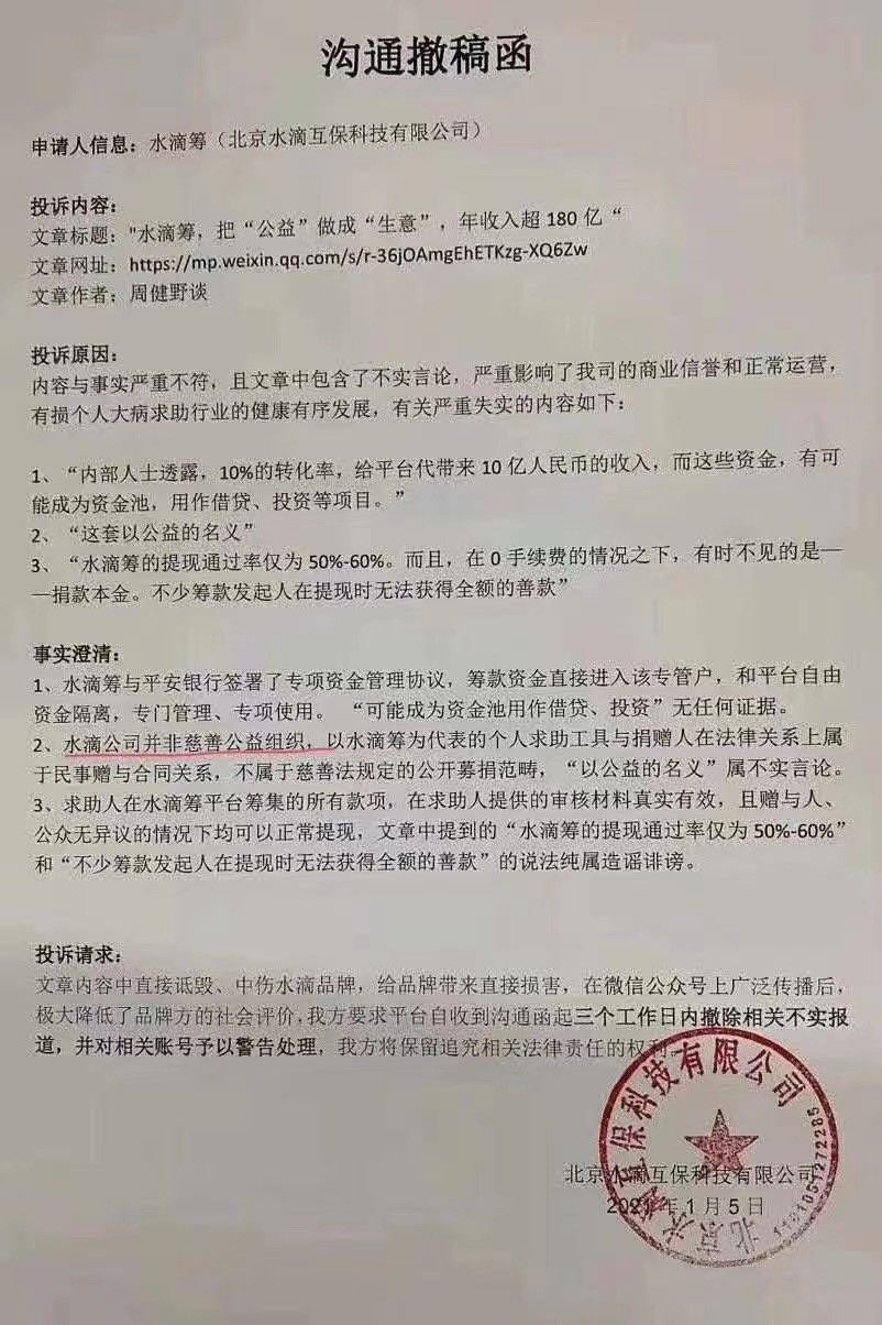 网传文件显示,水滴公司并非慈善公益组织,以水滴筹为代表的个人求助工具与捐赠人在法律关系上属于民事赠与合同关系,不属于慈善法规定的公开募捐范畴,“以公益的名义”属不实言论,其落款为北京水滴互保科技有限公司,并加章同样公司名字的公章。