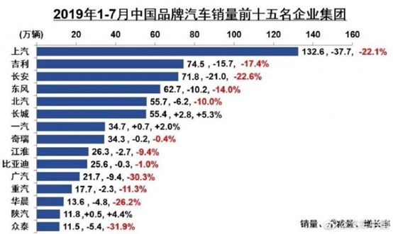 但随着中国汽车销量持续下滑的低迷环境,自主品牌份额持续失守,2019年上半年,国内乘用车产量976.2万辆,下跌16.3%。众泰汽车也成为自主品牌1-7月的前15名中的最后一位。