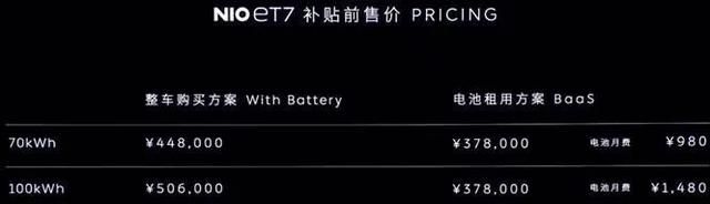 搭载70瓦电池ET7补贴前售价44.8万元,搭载100瓦电池ET7补贴前售价50.6万元。ET7首发版搭载100瓦电池,补贴前售价52.6万。Baas方案补贴前售价均为37.8万元,70瓦电池月费980元,100瓦电池月费1480元。