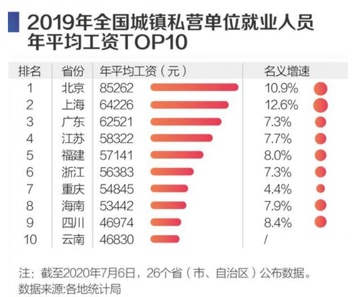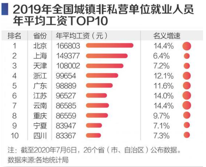 据21世纪经济报道此前统计,在城镇非私营单位中,北京、上海、天津年均工资最高,2019年均在10万元以上;在城镇私营单位中,居前三的则是北京、上海、广东,2019年年均工资均在6.2万元以上。