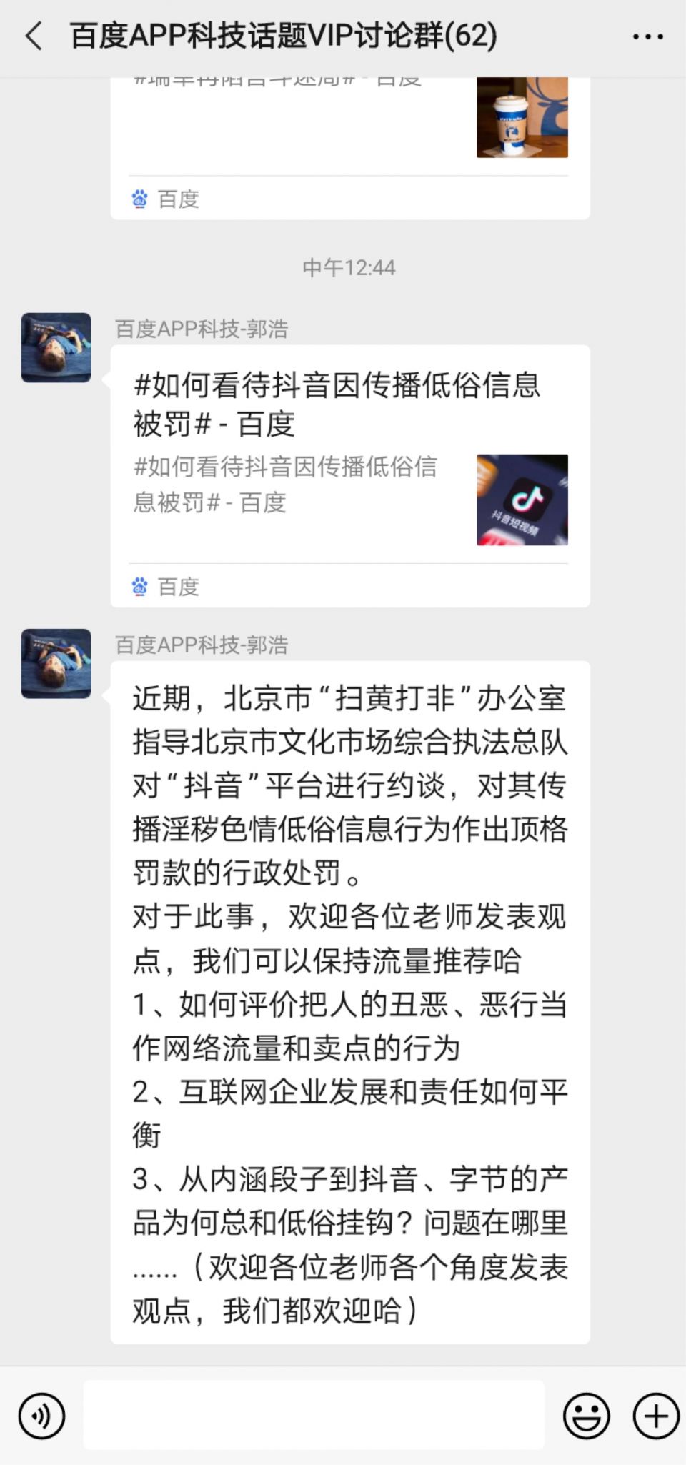 炣燃科技1月11日讯(方锐)近日,一张微信群聊截图在网上流传。截图中,一名疑似百度员工在一个名为百度APP科技话题VPI讨论群中发了两条信息,第一条是百度上刊登的关于“抖音因传播低俗信息被罚”的新闻,第二条则是给出了三个方向,号召群里的人发表相关观点:1、如何评价把人的丑恶、恶性当作网络流量和卖点的行为;2、互联网企业发展和责任如何平衡;3、从内涵段子到抖音、字节的产品为何总和低俗挂钩?问题在哪里?