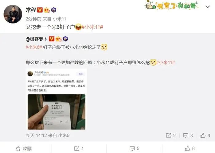 虽然手机“钉子户”仅仅是手机出货量下降的一个原因,但不少手机厂商对此也非常“头疼”。最近,小米副总裁常程就发微博为小米11挖走小米6“钉子户”而欢呼雀跃。