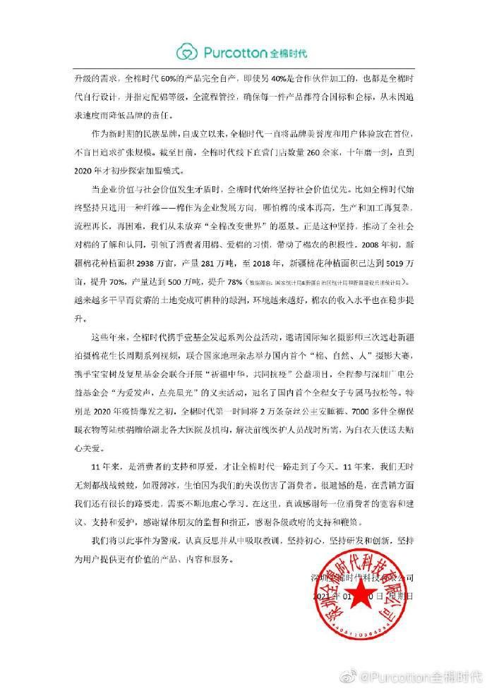1月10日,全棉时代在其官博@Purcotton全棉时代 发布两张“歉意表白”图片,就卸妆湿巾短视频事件道歉,全棉时代表示,“经公司整改小组全面调查,是我们内部的工作失误,让不符合品牌标准、违背企业价值观的视频上线,”并表示郑重地说声,“对不起,我们错了”。
