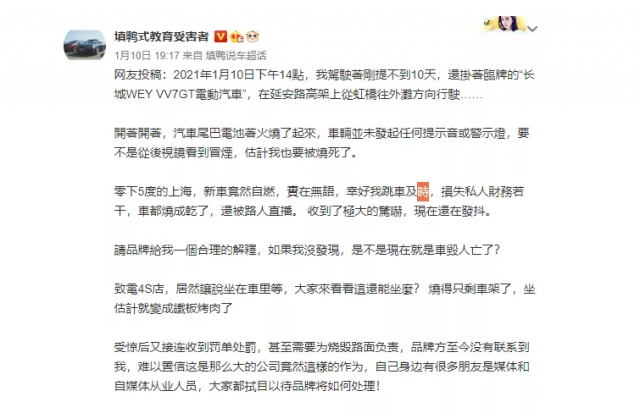 从车主自述中我们可以看到,这台新能源车提车不到十天的时间,在零下五度的天气下自燃,并且没有任何预警信息,给车主造成了极大的心理压力和恐惧。而且在起火过程中,车主紧急联系品牌方的4S店,4S店给出的专业答复竟然是让车主坐在车内等待救援。