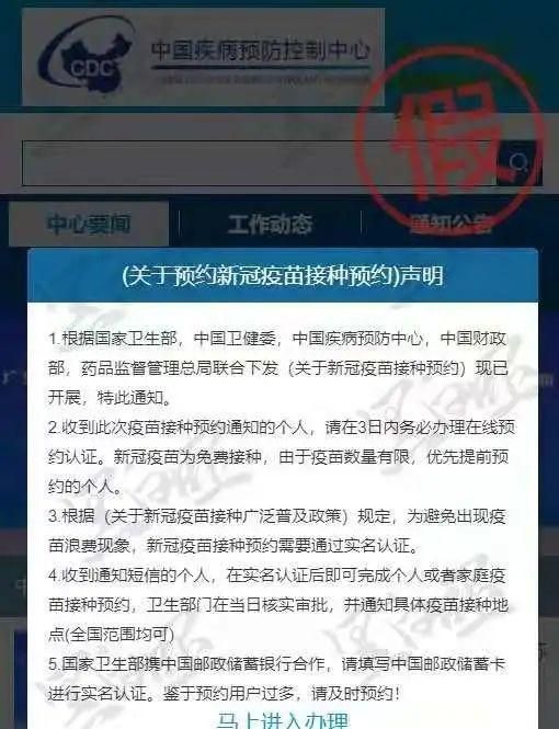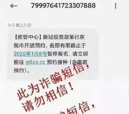 近日,多地市民收到假借官方机构名义发出的诈骗短信↓↓要求市民点击链接预约接种新冠疫苗。“【疾管中心】新冠疫苗政策已在我市开放预约,名额有限截止于2020年1月8号暂停报名,请立即前往xxx.cc预约接种(含家庭预约)。”