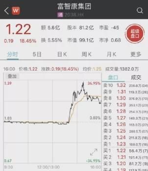 午后消息一出,富智康港股股价一度暴涨超30%,截至收盘,富智康涨18.45%,报收1.22港元/股。