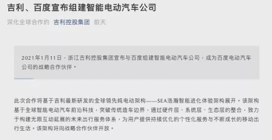 1月11日,百度宣布正式组建了一家智能汽车公司,以整车制造商的身份进军汽车行业,还首选了吉利控股集团成为新公司的战略合作伙伴。