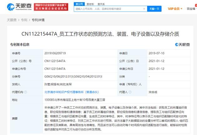 1月13日,有媒体报道百度在线网络技术(北京)有限公司于1月12日公开了一项专利,内容是 “员工工作状态的预测方法、装置、电子设备以及存储介质”,专利公开号为CN112215447A。