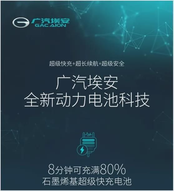 广汽埃安官宣即将发布全新的动力电池科技,预告称8分钟内能够完成80%的充电,续航里程可能接近1000km,其研发的石墨烯基超级快充电池即将在2021年量产搭载。
