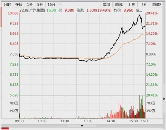 广汽集团在港股盘面同样出现大涨,盘中一度拉升至10.08港元,截至收盘报9.38港元,涨19.49%。