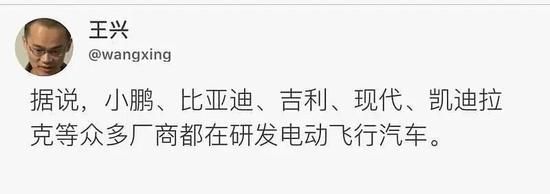 之后,美团CEO王兴点评道:“据说,小鹏、比亚迪、吉利、现代、凯迪拉克等众多厂商都在研发电动飞行汽车。”