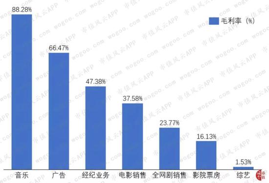 根据公司2018年年度报告,公司的音乐业务毛利率为88.28%,在所有产品中毛利率最高,广告业务毛利率为66.47%,位列其二,经纪业务为48.38%,排在第三位。而收入占比较大的全网剧销售、电影销售以及综艺业务的毛利率则排在后面,分别为23.77%、37.58%和1.53%。