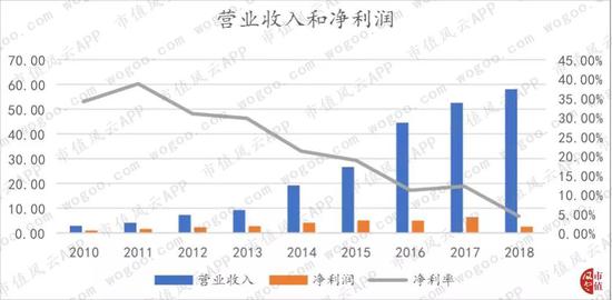 2010年至2017年,净利润也跟随营收保持了增长,从2010年的0.96亿元增长至2017年的6.36亿元,7年增长6倍多,年均复合增长率为31%。但是,2018年的净利润仅为2.5亿元,同比下降了约61%。