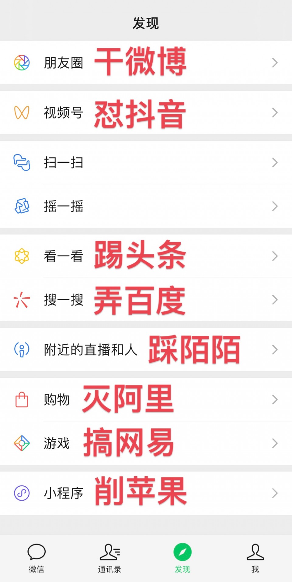 但事实上,微信一直在模仿、承接别家产品已有的功能。张小龙今年重点提到的几大功能,“搜一搜”直指百度,“视频号”和“直播”直指抖音和快手,“输入法”直指搜狗。在某种程度上,这也是“走别人的路,让别人无路可走”。