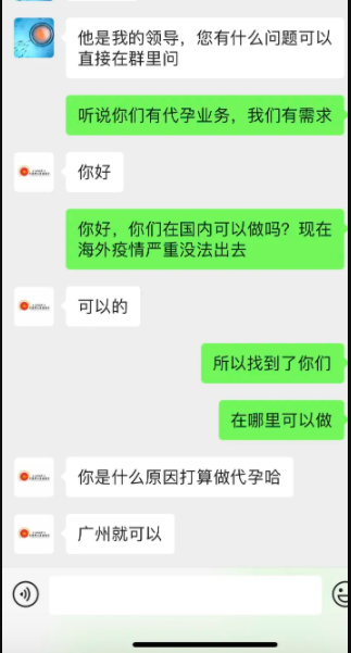 这个“领导”自称姓刘,实际上就是一个业务经理。在微信群里的沟通中,刘经理向记者表示,他们的确有代孕业务,在武汉、广州、上海均可以做。