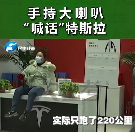 近日,一位特斯拉女车主王女士,因特斯拉汽车续航问题,手持大喇叭在特斯拉郑州中原福塔店喊话维权,“买车时宣称续航468公里,实际只跑220公里,消费者购车时切勿上当”。
