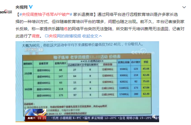 商业 央视调查柚子练琴APP破产:数千元培训费无法退回 2021-01-24 09:48:23 分享 来源:央视网通过网络平台进行远程教育培训是许多家长选择的一种培训方式,但伴随着教育培训平台的增多,问题也随之出现。前不久,本台记者接到家长反映,称一家提供乐器陪练的网络平台突然无法登陆,所交数千元培训费用无法退回,记者对此进行了调查。