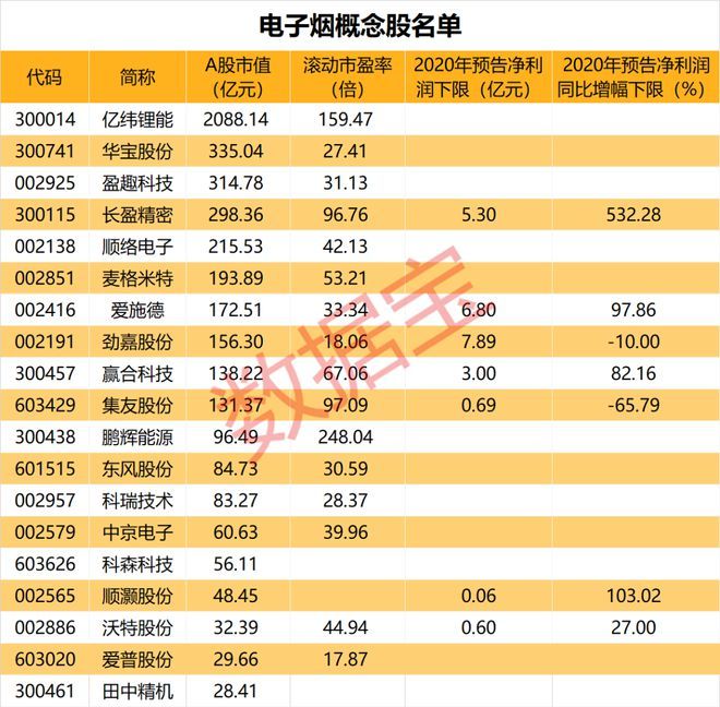 根据证券时报·数据宝的梳理,A股中电子烟概念板块内,共有19只股票。亿纬锂能、华宝股份、盈趣科技、长盈精密的总市值规模居前。