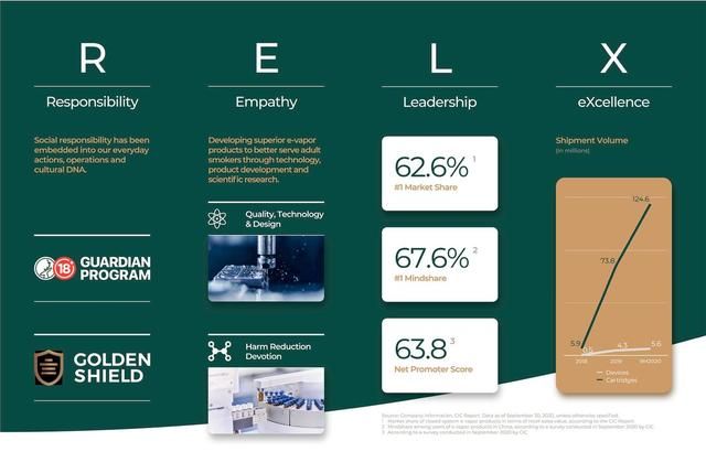 悦刻的赚钱能力不容小觑,2020年的前三季度中,公司市占率达到62.6%。仅是第三季度,悦刻的烟杆和烟弹的销售数额就分别达到300万套和6190万颗。悦刻的业务增速迅猛,仅是2020年第三季度的销售成绩就占到了成立以来所有的近30%。 相当于,悦刻现在一个月就能卖出超过2000万颗烟弹。
