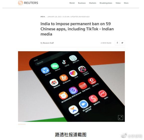 综合《印度时报》和路透社等外媒26日消息,印度电子和信息技术部发布最新通知,将在今年6月永久禁止59款中国手机应用程序,包括TikTok(抖音海外版)、百度、Wechat(微信)和UC浏览器等。