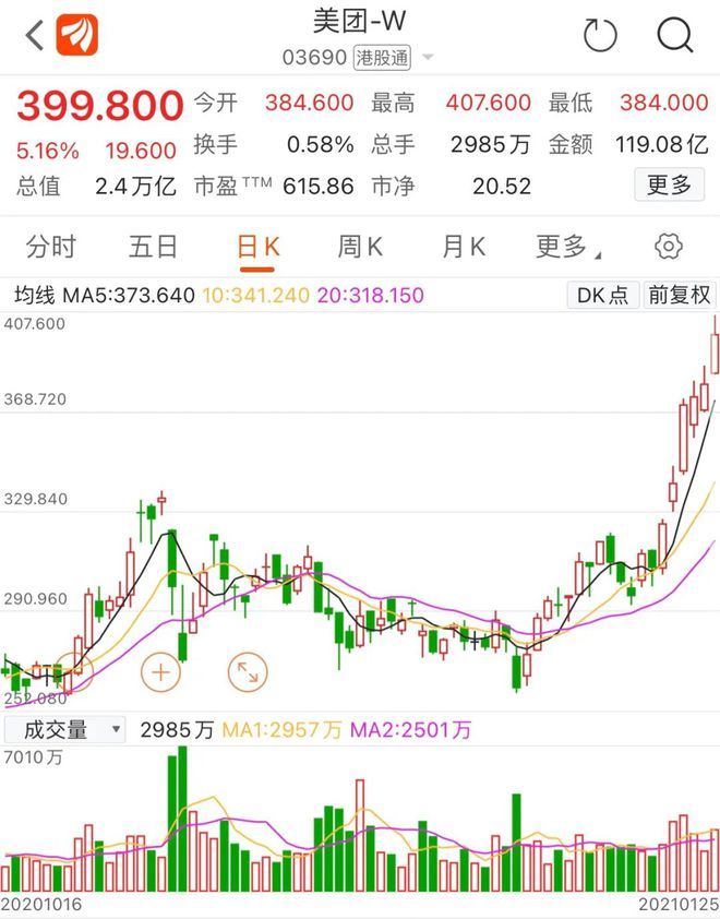 美团25日大涨5.16%,盘中首次突破400港元,总市值达2.35万亿港元。短短两年时间,美团股价已翻了10倍以上。2019年初,美团股价一度低至40.25港元。