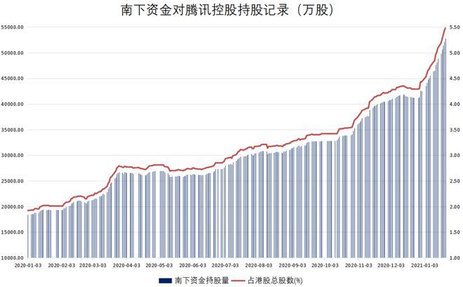 2021年以来,南下资金净买入腾讯602亿港元,排名第一。