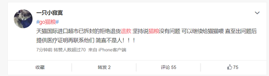 有网友表示,天猫国际进口超市拒绝已拆封的猫粮退货退款,坚持说猫粮没有问题,可以继续给猫猫喂,直至出问题后提供医疗证明方可退款。