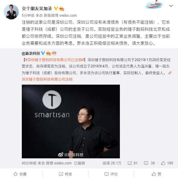 1月27日午间消息,针对“深圳锤子数码科技有限公司已注销”一事,罗永浩所在的“交个朋友”回应称: