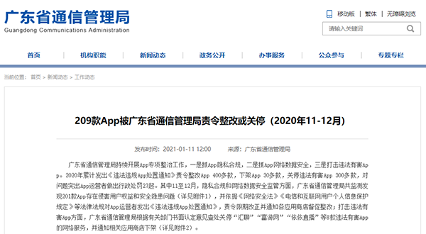 日前,广东省通信管理局发布2020年11月至12月的APP专项整治工作情况,共监测发现201款App存在侵害用户权益和安全隐患问题。