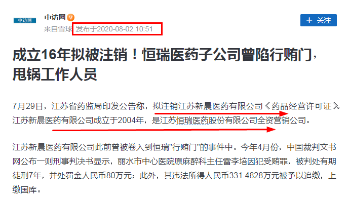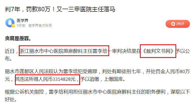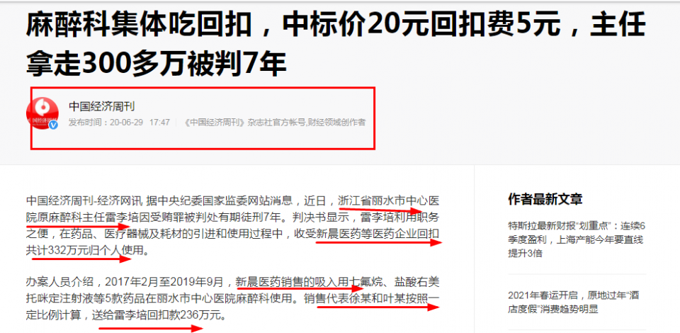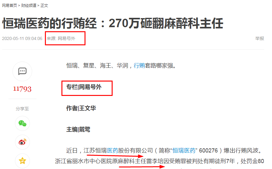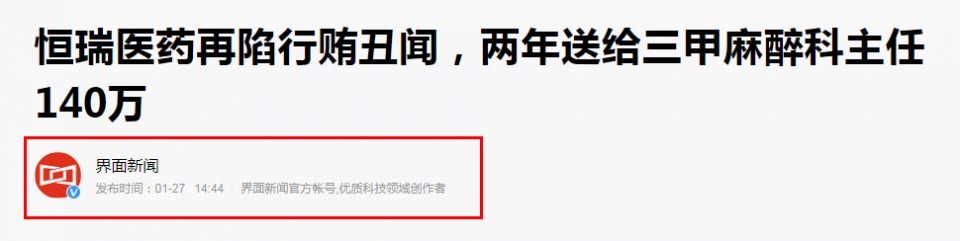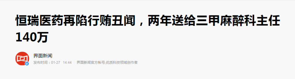 回到文章本身。我们的小编看到《界面新闻》这则新闻后,便在此基础上撰写了前述《医药“市值一哥”再曝贿赂案:恒瑞医药140万“黑金”腐蚀麻醉科主任》的文章。