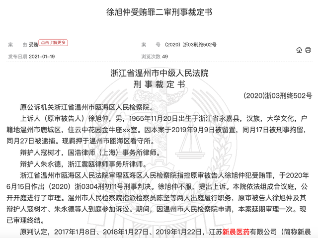 浙江省温州市中级人民法院2021年1月19日发布《刑事裁定书((2020)浙03刑终502号)》,对原温州医科大学附属第一医院(简称温医大附一院)麻醉科主任徐旭仲受贿一做出终审裁定,认定徐旭仲先后三次收受财物合计140万元,构成受贿罪。