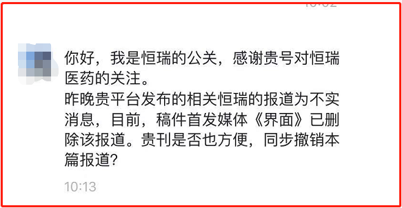留言截图说:昨晚贵平台发布的相关恒瑞的报道为不实消息,目前,稿件首发媒体《界面》已删除该报道。贵刊是否也方便,同步撤销本篇报道?